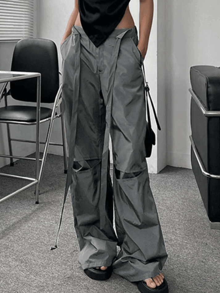 Description: Step up your streetwear game with these trendy Tie Strap Parachute Cargo Pants. Designed with a straight-leg silhouette and a waist adorned with long tie straps. these pants exude effortless style. The cutout details on the knees add a touch of edginess. while the front side pockets provide functionality and storage. Complete with an eye-hook zip fly. these pants are a must-have for the fashion-forward Gen Z woman. Stay on-trend and make a statement in these versatile and comfortable parachute pants.