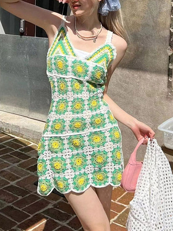 Description: Made from crochet knit fabric. this cute dress shaped to a fitted silhouette. with an open back and scalloped edge design.
