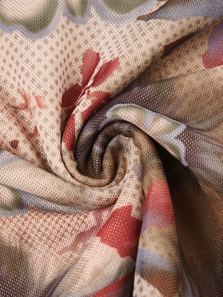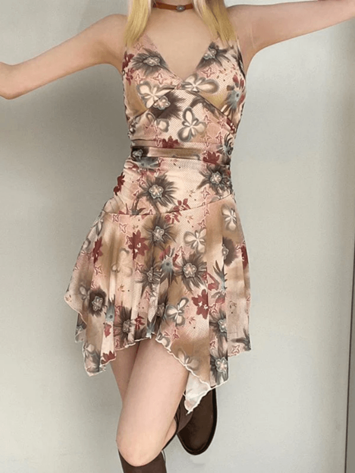 V-Neck Floral Waist Pleated Mesh Mini Dresses