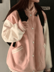 Description: Get the perfect blend of vintage and modern with our Patchwork Varsity Jacket. Designed for the trendy Gen Z woman. this jacket exudes casual street style with a touch of nostalgia. Crafted from a high-quality polyester blend. it offers a comfortable loose fit that's ideal for everyday wear. The stand collar and long sleeves provide extra warmth. while the snap button fastening adds a fashionable twist. Complete with elasticated cuffs. contrast stripe details. and functional pockets. this jacket combines functionality and fashion effortlessly. Available in stylish Pink/Blue. it's time to make a statement with your outerwear. Step up your fashion game and grab this jacket today!
