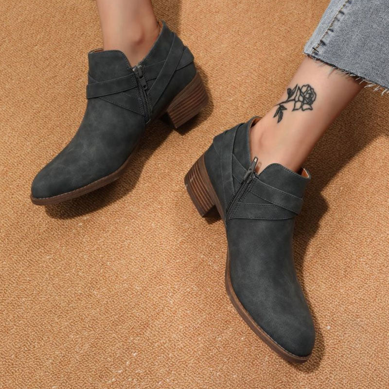No one does it quite like the retro style strap ankle booties. Crafted with smooth suede and rubber. stand out in crisscross ankle straps accentuated with an antique-style adjustable buckle. featuring a pointed toecap framed by a suede upper. topstitching details. a tonal side zipper closure. a cushioned footbed and a synthetic sole. a mid block heel adorned with wooden-like stripes. Find more trendy women's suede boots and unique shoes in our boutique. and wear them with a nostalgic dress and a long-sleeve blazer - Heel height: 4.5cm.