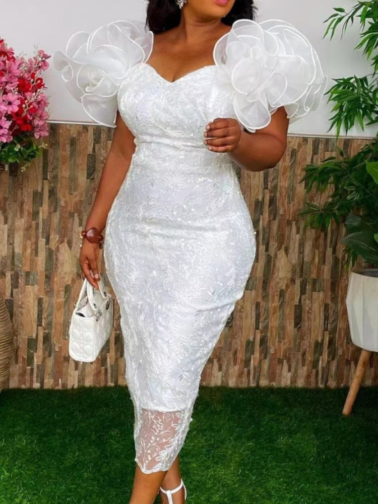 White Dress for Women Classy Party Bodycon Off Shoulder Patchwork Ruffles Sleeves Female Evening Wedding Guest Event Occasion XL
